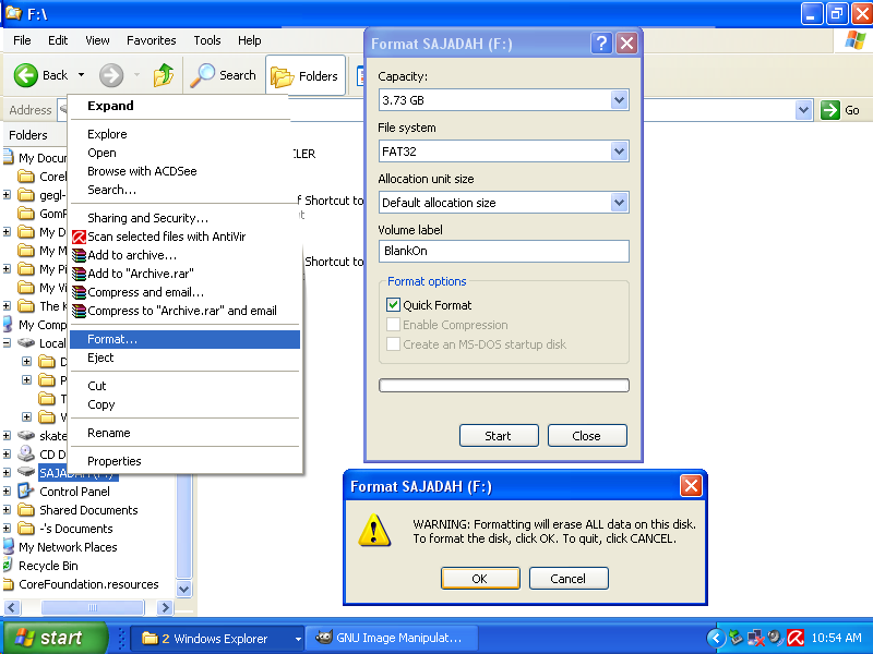 Pertama Format Flashdisk Anda dengan jenis FAT32, jika Anda memakai Flashdisk yang sudah ada isinya, silakan backup dulu isinya ke hardisk atau ke media simpan lainnya dengan cara Salin-Tempel.